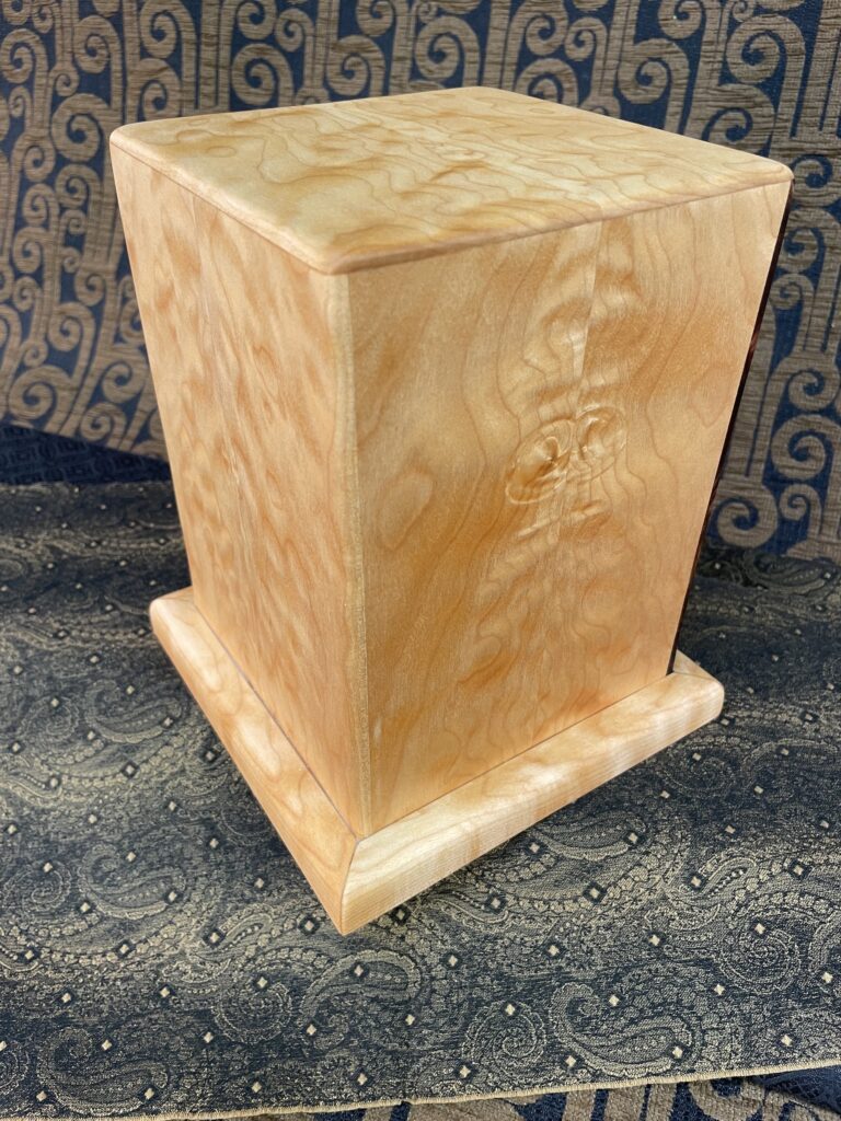 Urns start at $550 (Canadian dollars). Standard sizes of our Cremation Urns are usually 22 x 17 x 15 cm (9″ x 7″ x 6″), but custom sizes can be created. All are sealed from the bottom, featuring a removable plate via four screws. Aromatic Cedar interiors are an option. Please email Brian – (baggetthouse@gmail.com) or call (306) 331-7736 to discuss possibilities, options, and pricing. We ship worldwide.
