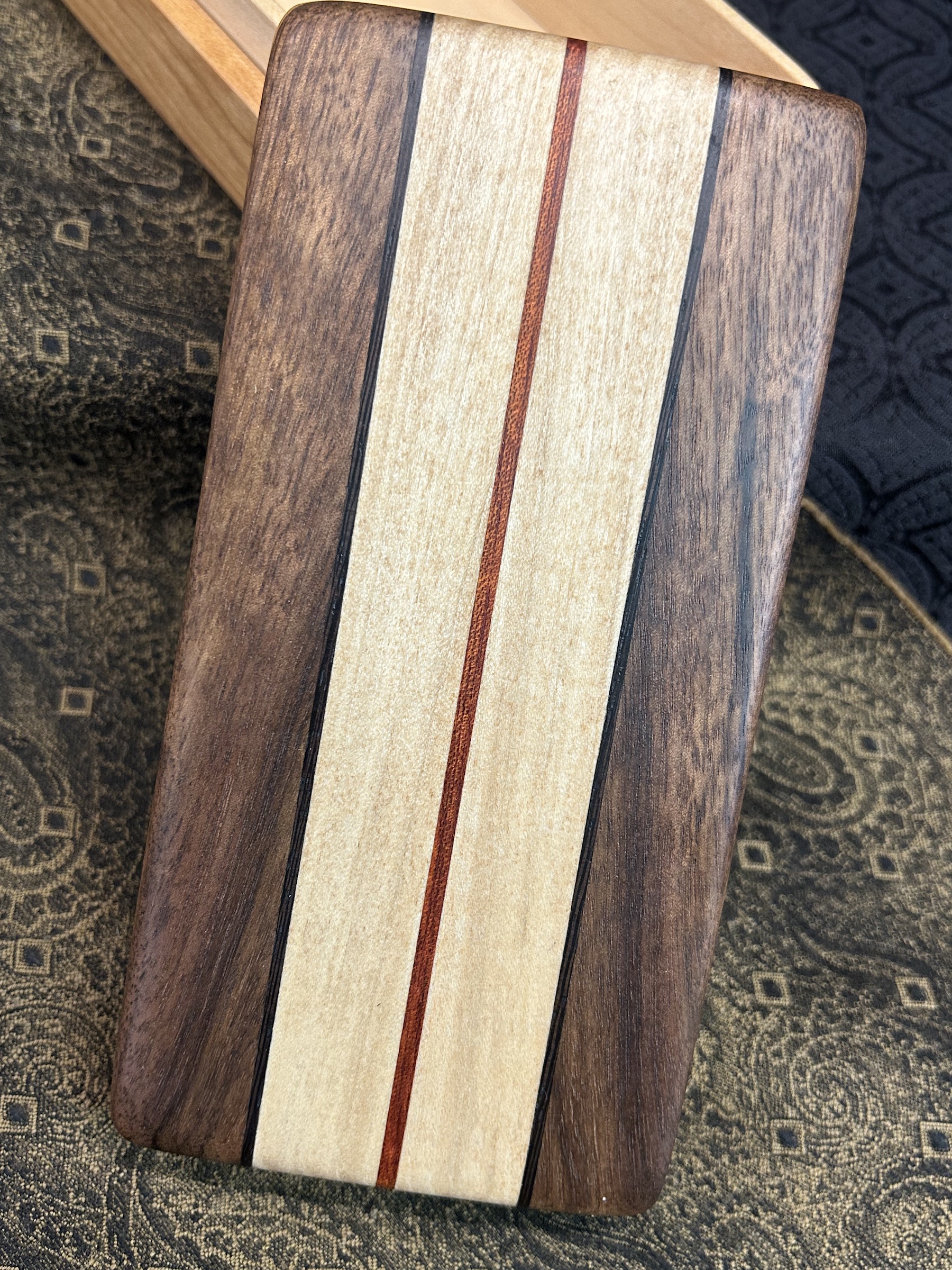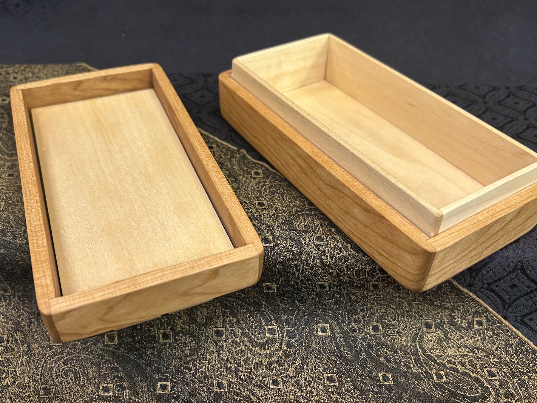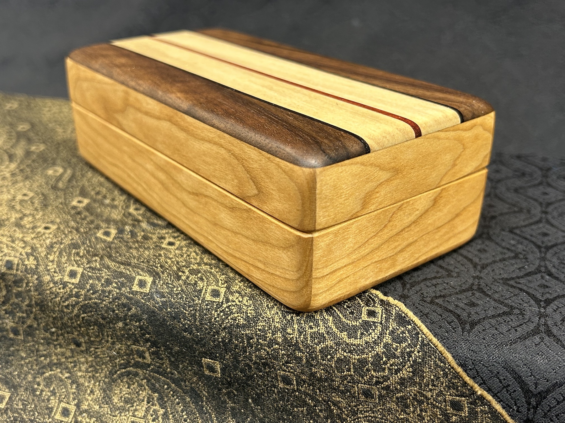 This Classic model friction top box is made of North American Cherry. Featuring a 7-piece top of Bloodwood, Poplar, Wenge, and Walnut. Maple interior. 4-piece bottom.