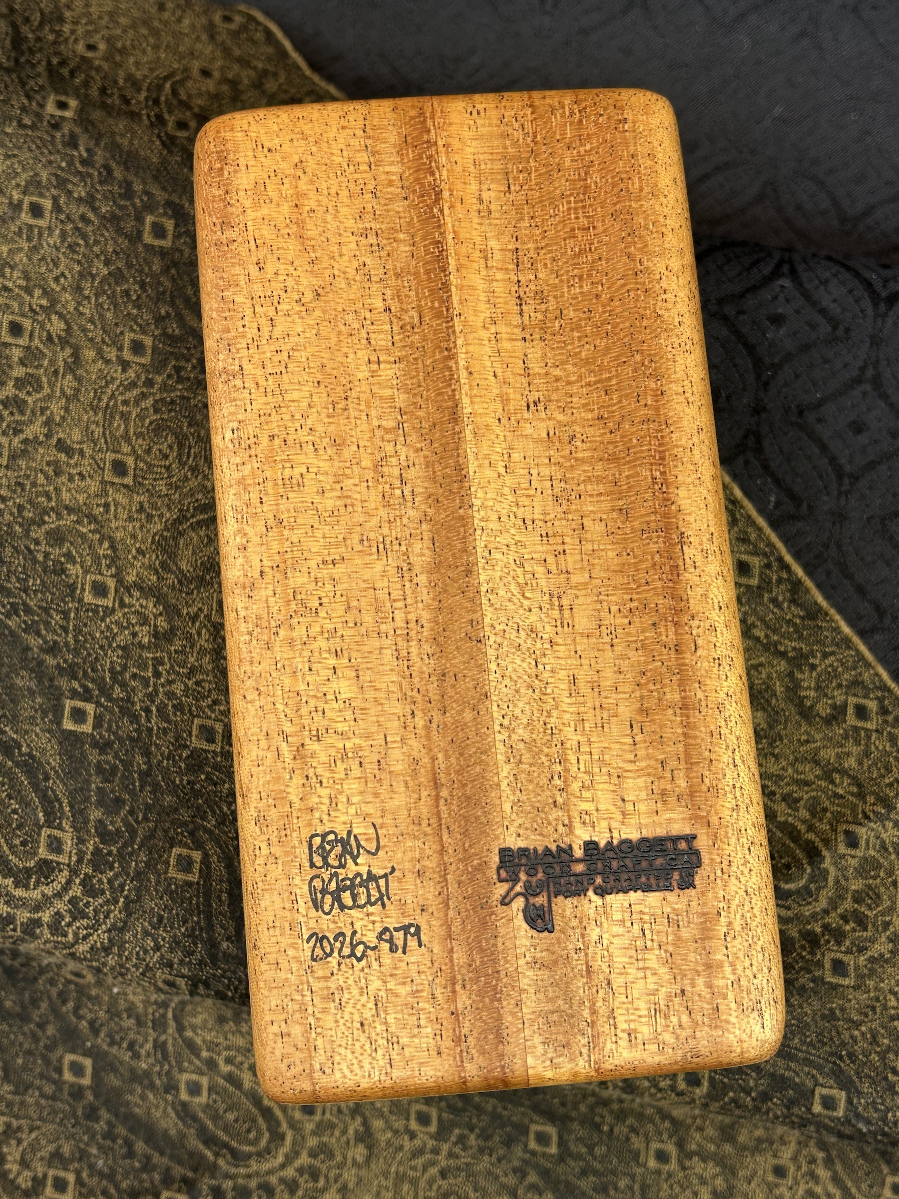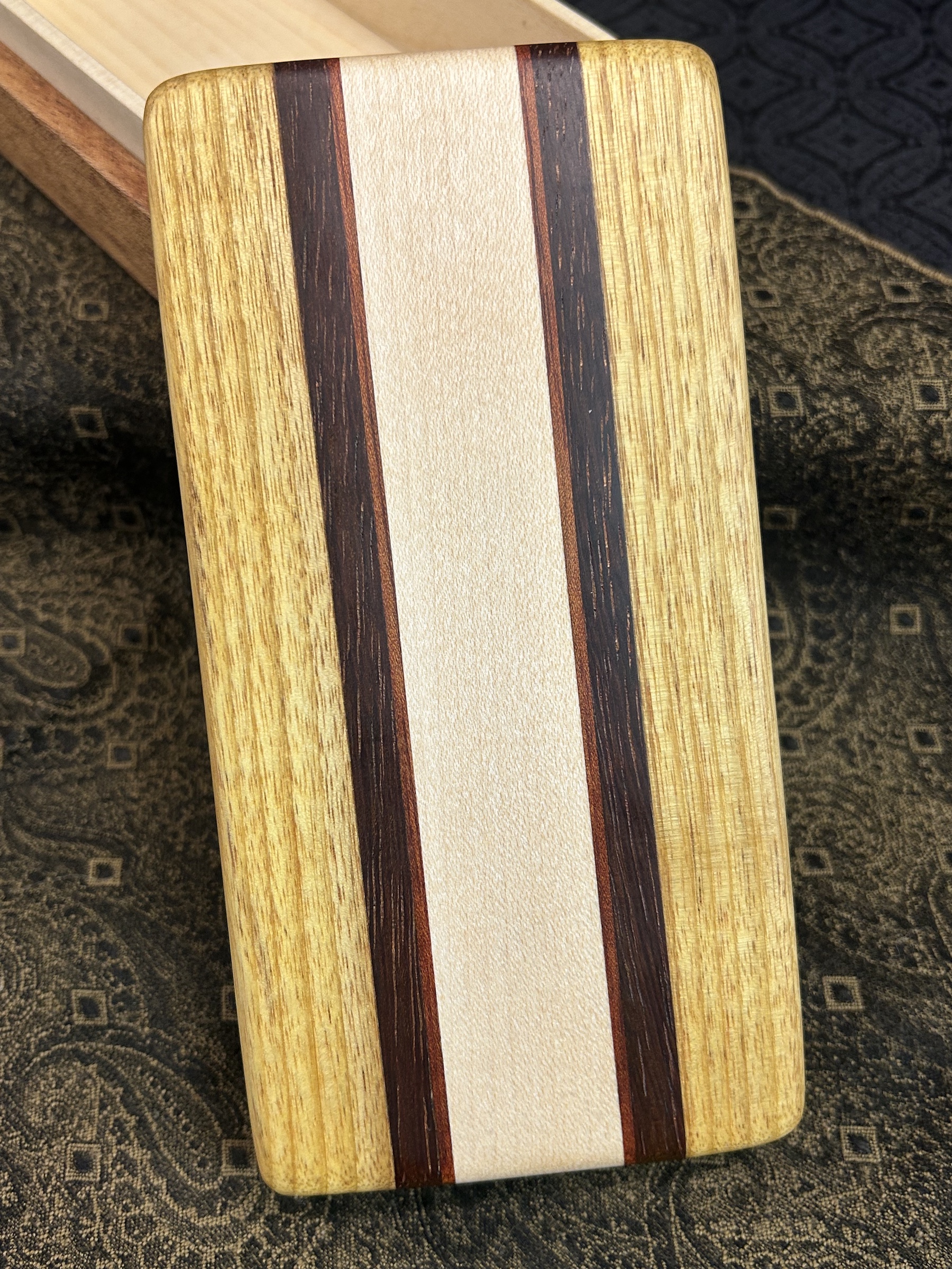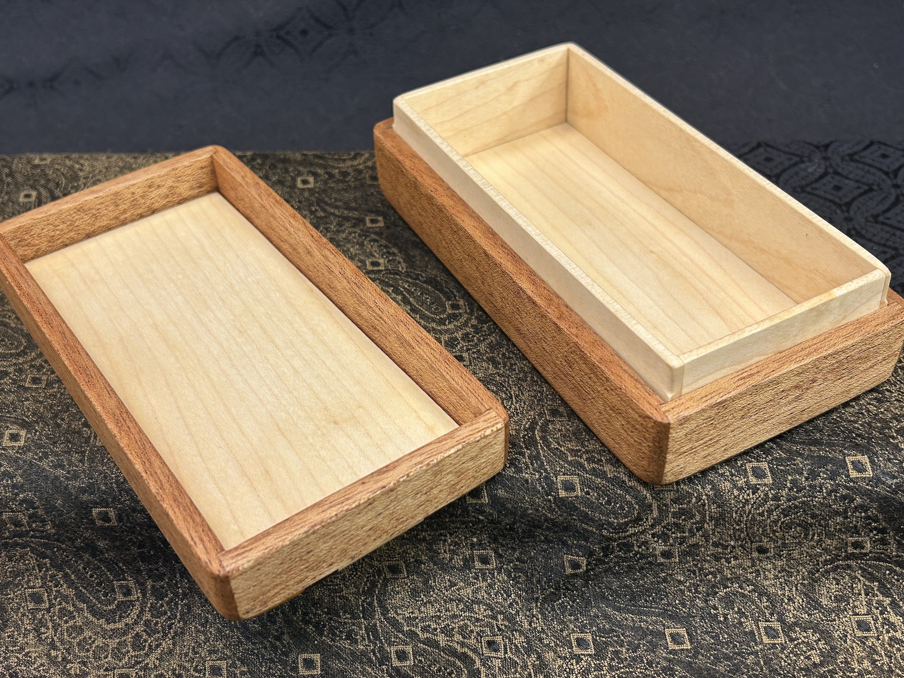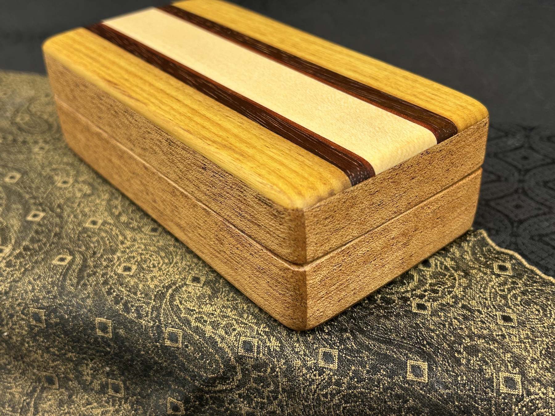 This Classic model friction top box is made of African Mahogany. Featuring a 7-piece top of Maple, Bloodwood, Ironwood, and Yellow Tarara, aka Canarywood. Maple interior. 2-piece bottom.