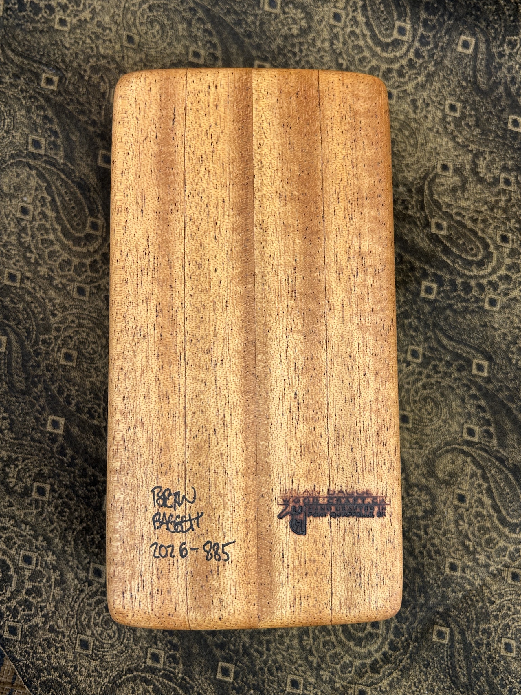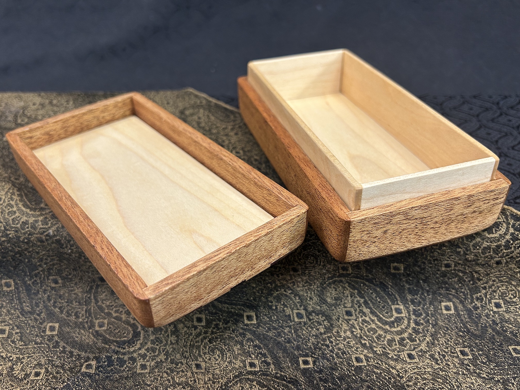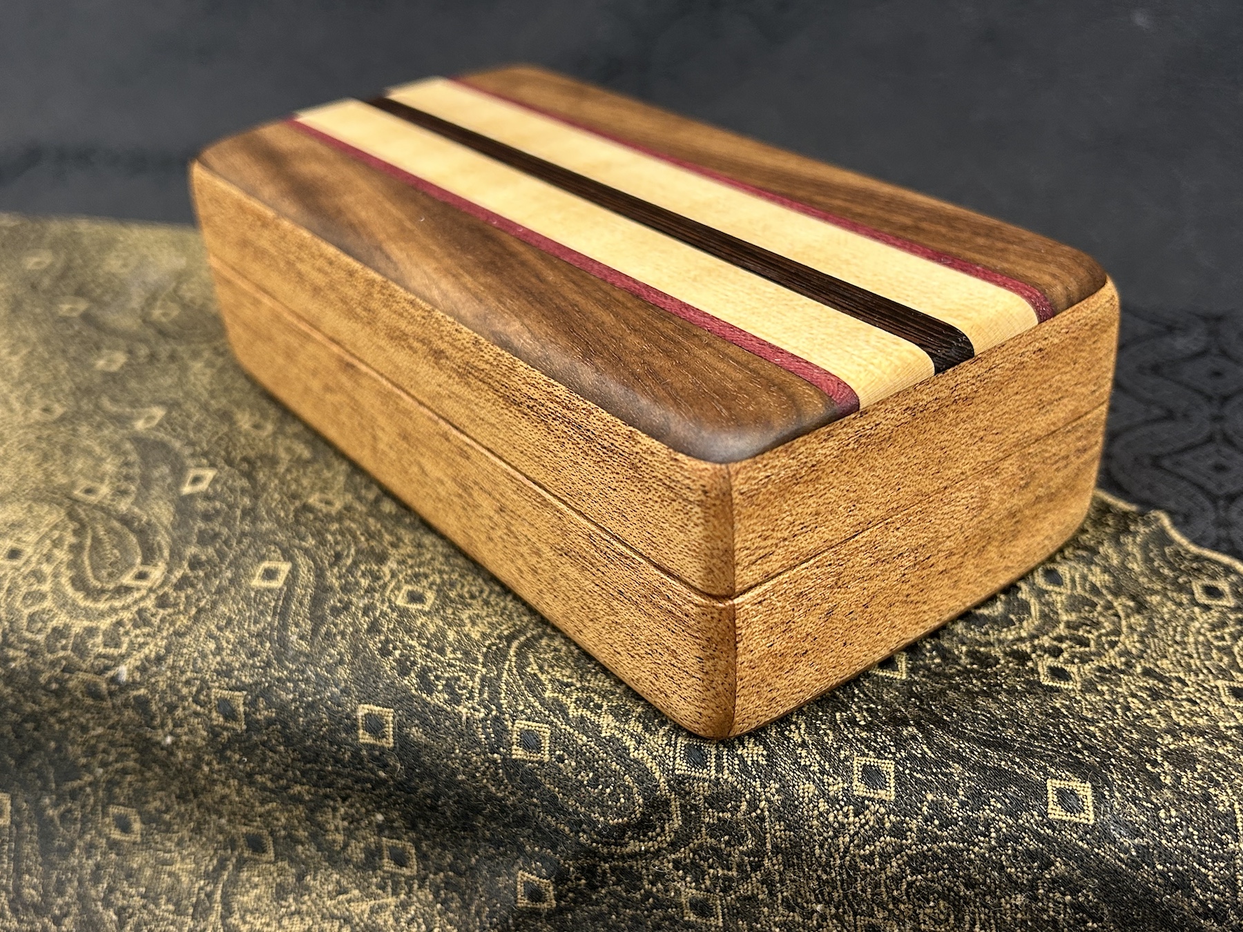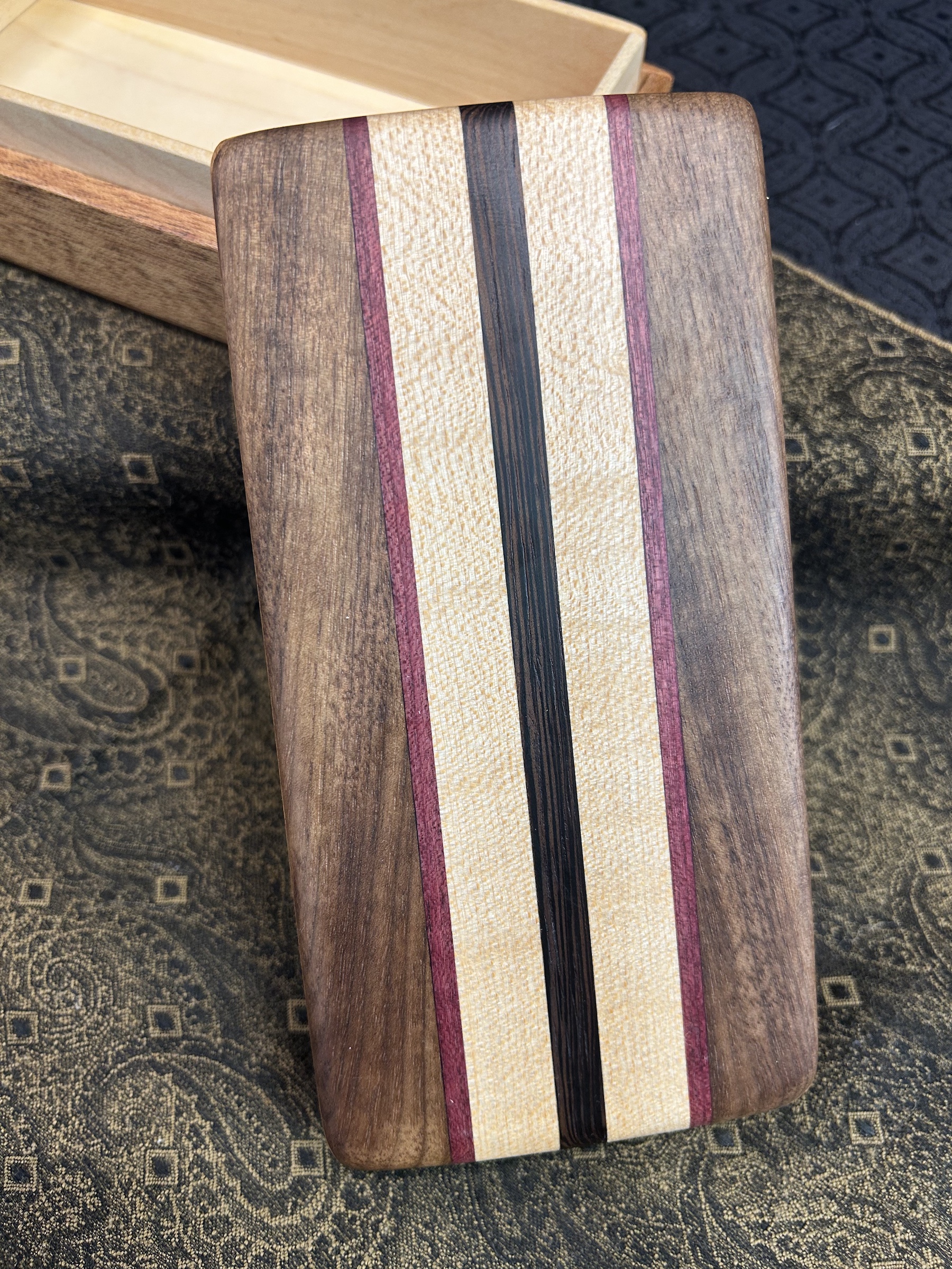This Classic model friction top box is made of African Mahogany. Featuring a 7-piece top of Wenge, Maple, Purple Heart, and Walnut. Maple interior. 2-piece bottom.