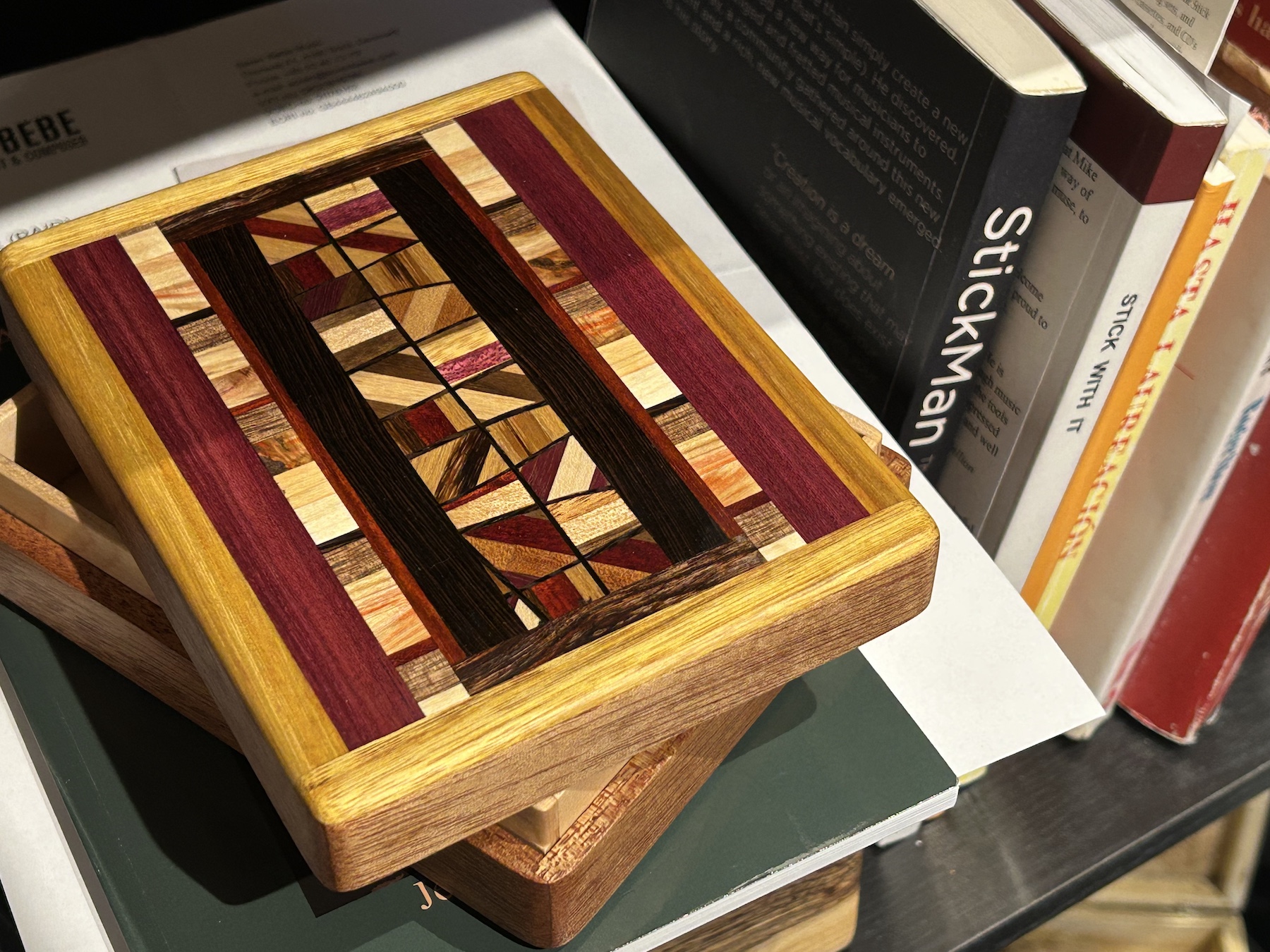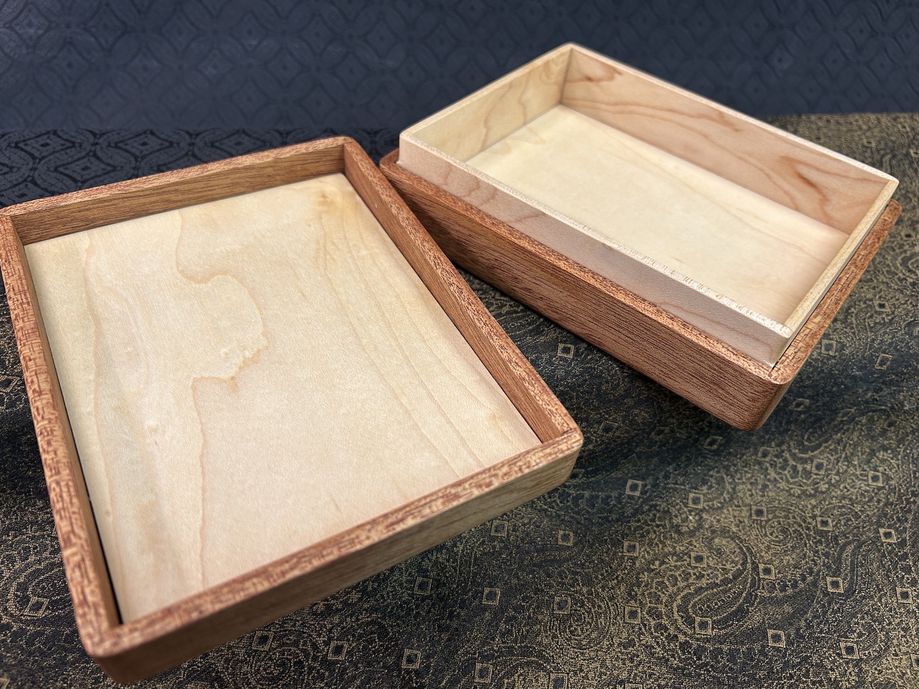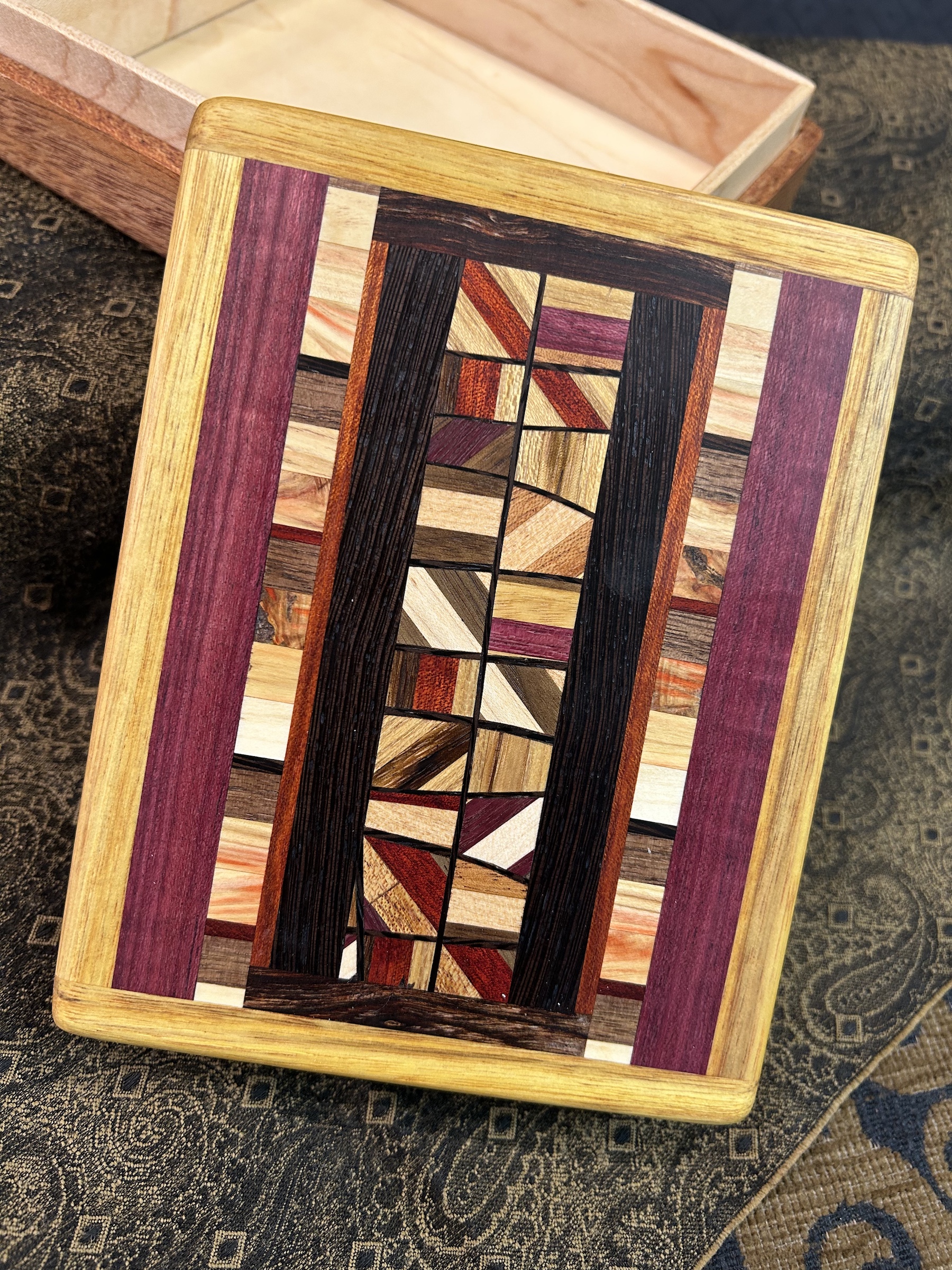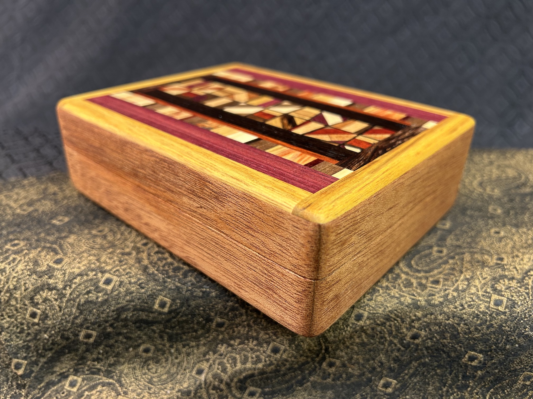 Keep you memories and meaningful items in this African Mahogany MID-Sized Friction Top box. The lid contains a 144-piece Mosaic framed in Yellow Tarara (aka Canary Wood). Maple interior. 5-piece bottom. Finished in Tung Oil and protected with a local beeswax/Tung Oil mix, giving a smooth, satin feel.