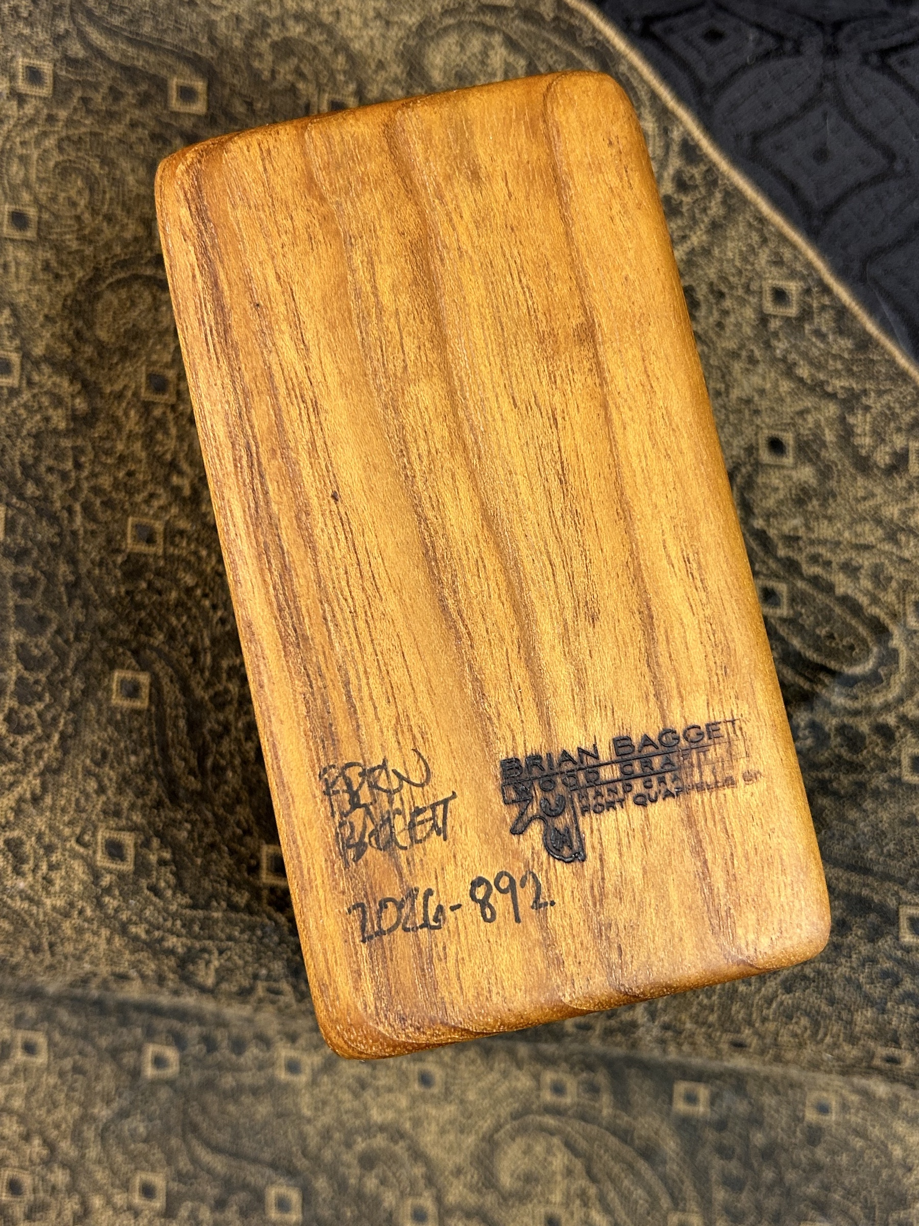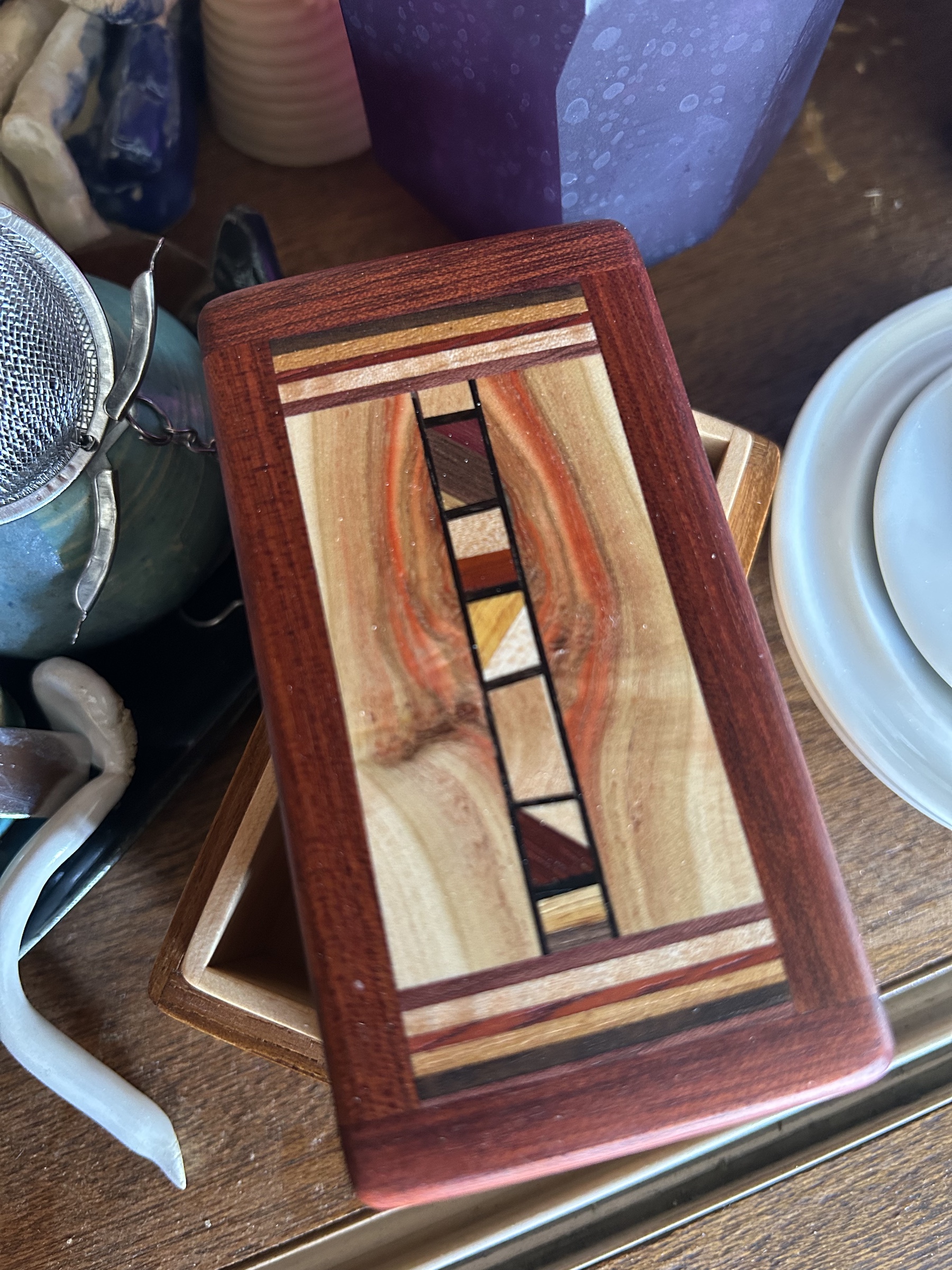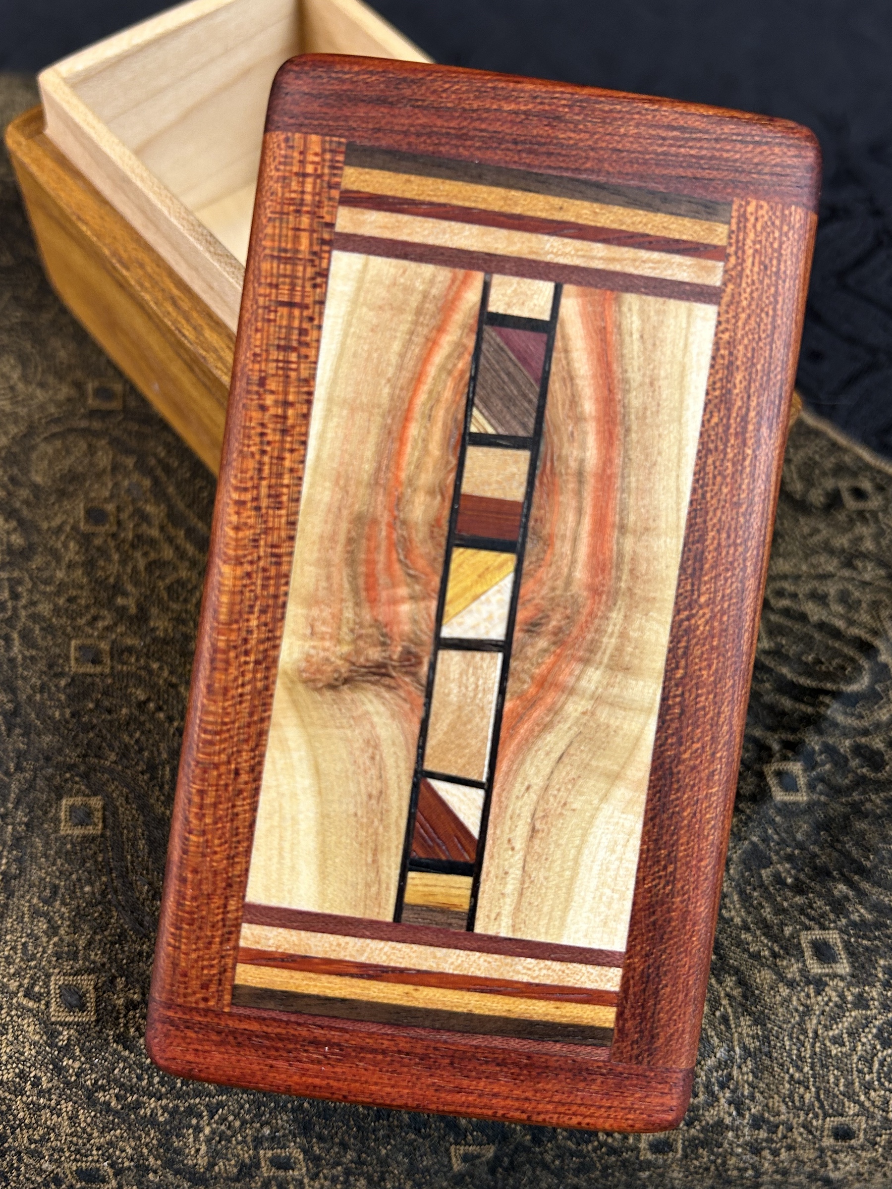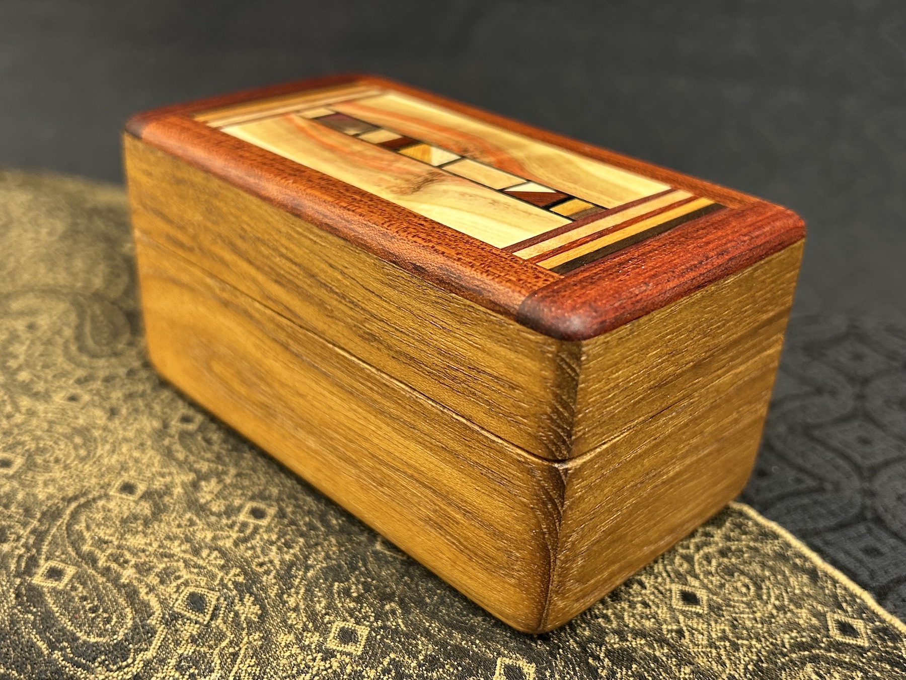 This MINI box is crafted from Teak salvaged once upon a time from a University workroom. The top features a 38-piece mosaic framed in Bloodwood. Maple-lined interior. Solid piece bottom plate.