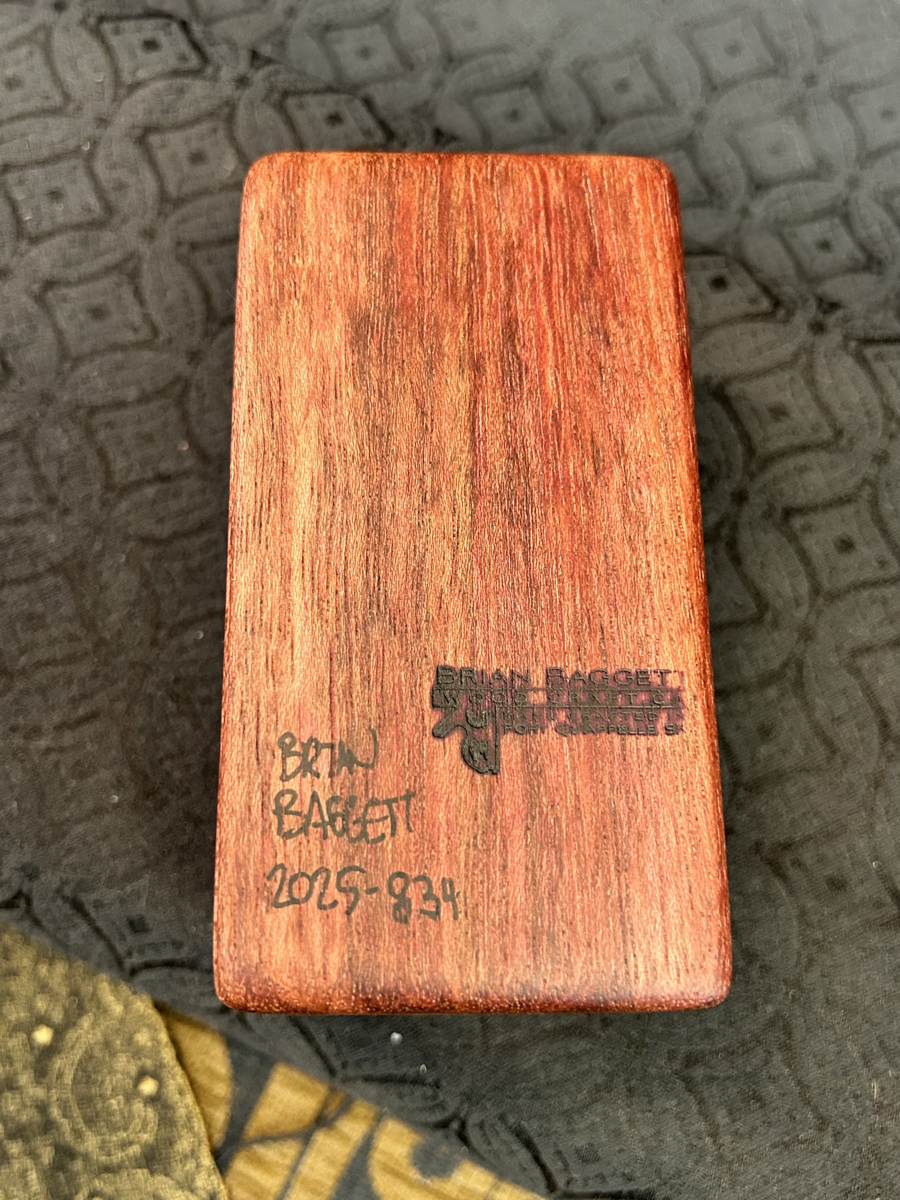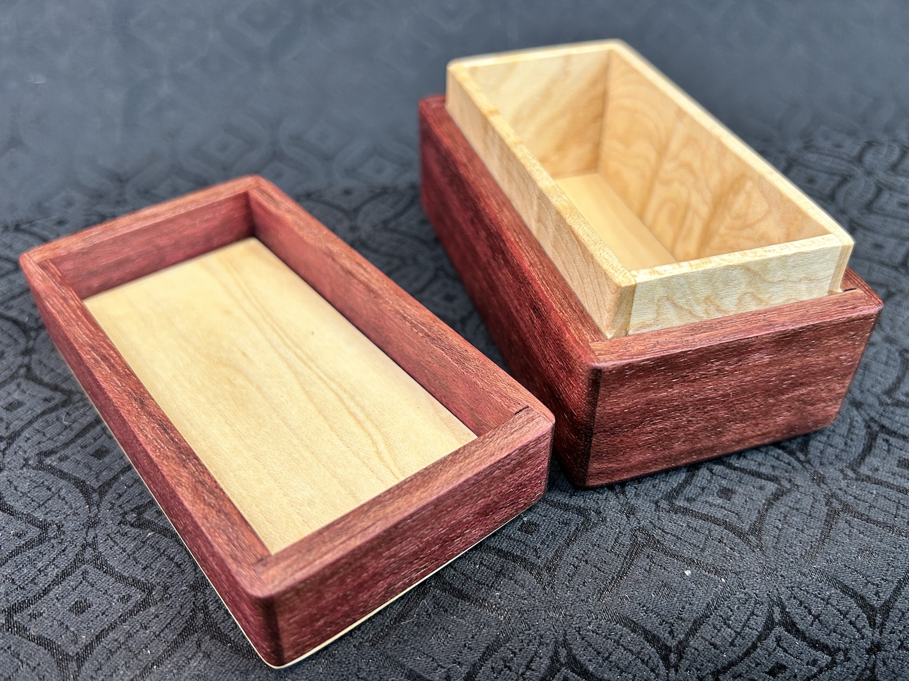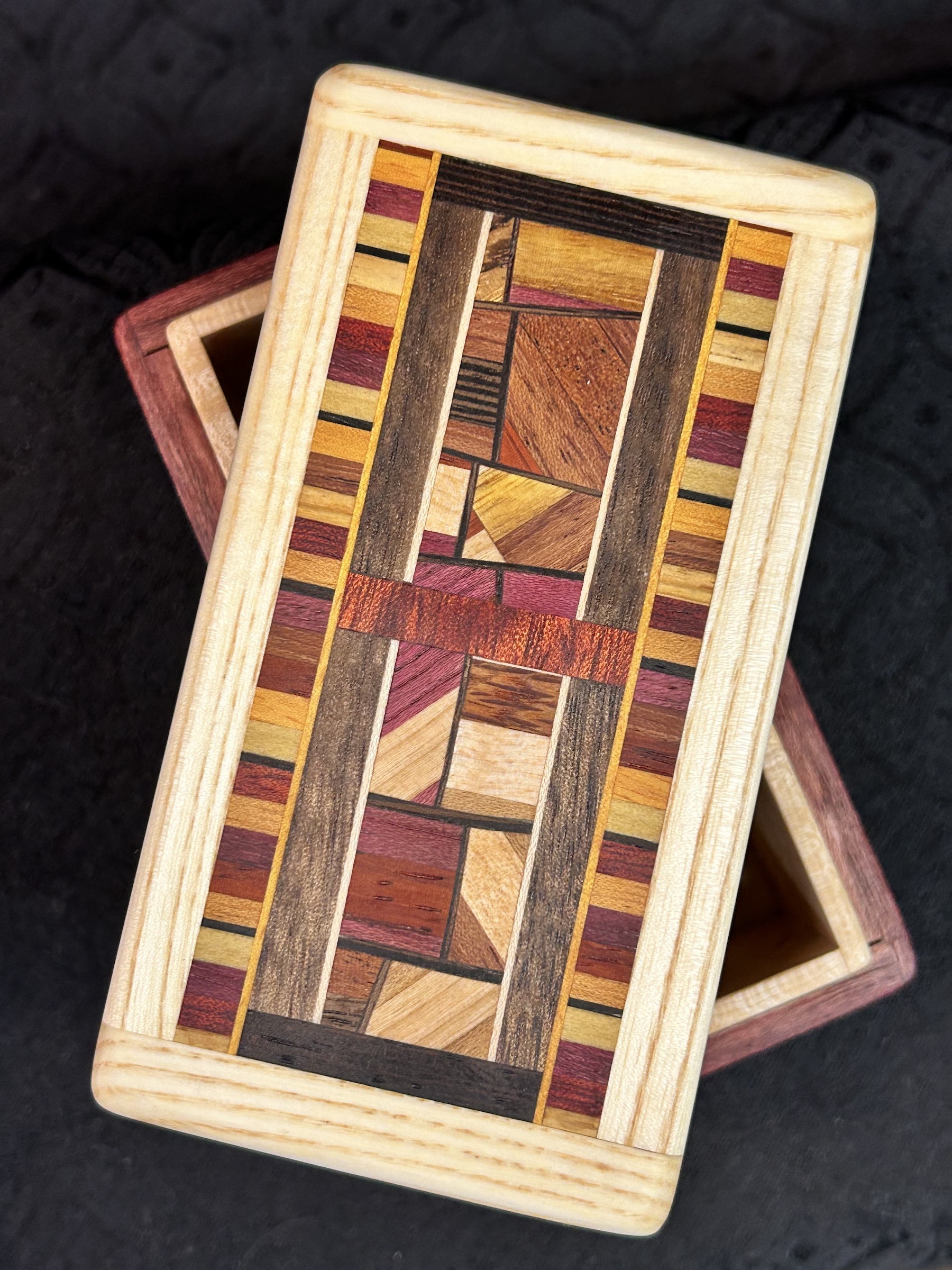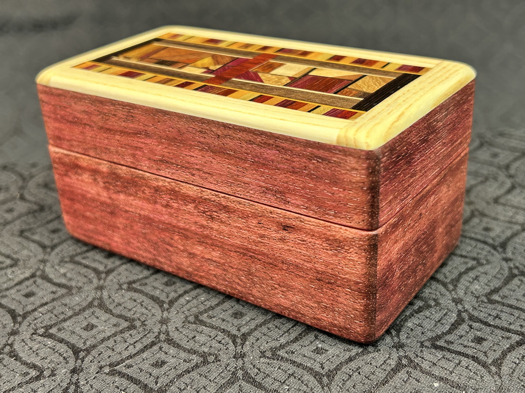 Central American Purple Heart is the base material for this MINI. Featuring a 134-piece Mosaic top framed in locally harvested Ash. Maple interior. 2-piece bottom. Finished with Tung Oil and a local beeswax/oil mix, giving a smooth satin feel.
